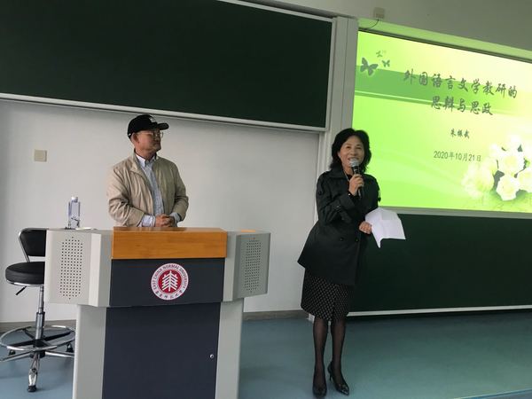 朱教授从翻译中的实例出发,探讨如何正确处理翻译作品中隐含的意识形态问题,以及进行思辨教研的必要性,尤其指出“不要歧视地翻译,也不要仰视地翻译,更不要奴译,而是要平等的翻译”。随后,对于如何对待外语,如何对待翻译,如何对待外宣,朱教授结合亲身经历,阐述了观点与看法。在关于阅读及对当下文化的批判性思考中,提出了解美国等国外文学文化的必要性,主张要学习人类一切优秀文明成果,换个角度看世界。朱教授以真实案例证明了美国等西方国家主张的自由有其限度,他们并不允许一味无限制的自由;在教材与教育的重心中,发现美国的语文教材非常重视对本国传统文化和爱国主义的教育。辅以详实的例证,朱教授还就创作和创作的重心、污染与生态保护等表达了要立足本土文化,不要盲听盲信,不要在盲目崇拜的同时失去自我的看法。最后,针对教研中的思辨与思政课题,朱教授以“中外文化比较与思辨导航”课程课旨为例,指出培养国际视野与本土情怀,增强学生的文化感观和认知水平的重要性。