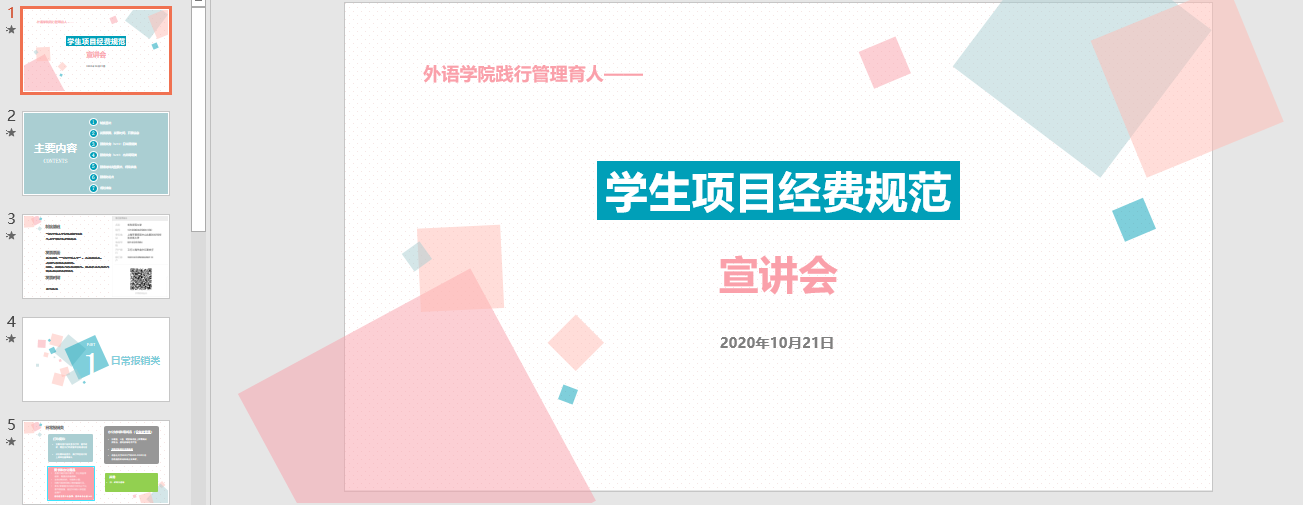 10月21日,外语学院召开学生项目经费专场宣讲,就学生培养费、学生创新创业项目经费、研究生语思科研基金项目经费进行线上解读,具体讲解学校财务规章制度和学院经费管理规定。参加本次财务宣讲会议的包括2020级外语学院新生、外语学院各专业创新创业项目本科生、语思科研项目研究生,以及学院财务办公室陈琴老师、刘符蓉老师和本科生双创团队冯园园老师。
