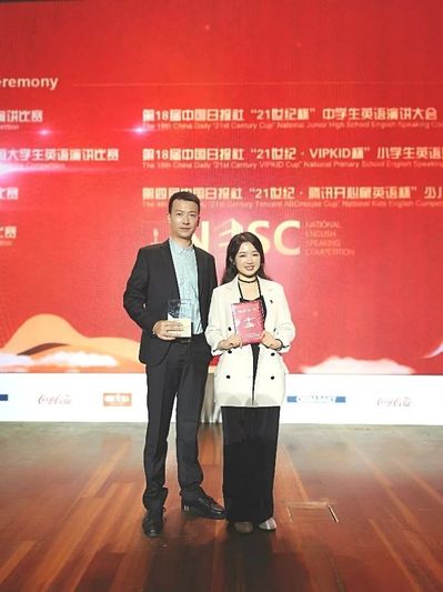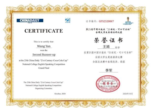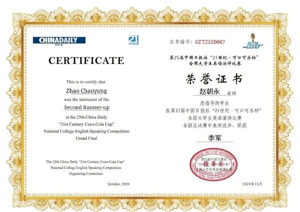 第25届中国日报社“21世纪•可口可乐杯”全国大学生英语演讲比赛半决赛与总决赛于2020年10月5日至8日在广州白云国际会议中心举行,外语学院大学英语教学部赵朝永副教授带领法学系王嫣同学参赛。在强手如林、竞争异常激烈的总决赛中,王嫣同学再次表现出超凡实力,在半决赛中以第一名的优异成绩出线,并在总决赛中最终获得全国季军佳绩。
