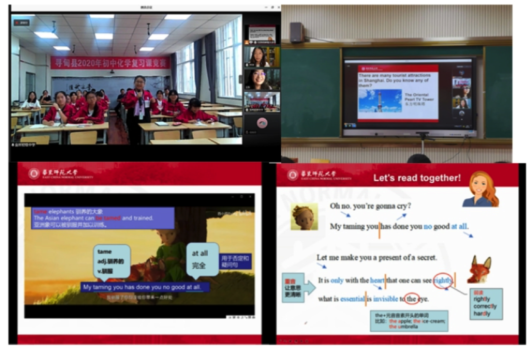 秉承“求实创造,为人师表”理念,发挥学校师范特色和外语学院学科专业特点,展现大学生实践育人积极作用,2020年7月,外语学院组织了一支20人学生志愿团队与云南省寻甸县金所中学开展英语口语教学活动。采取腾讯会议线上形式。课程主要围绕语法学习和口语语音教学展开,选取生动活泼的动画电影片段为素材,通过造句、听音填词、跟读模仿和配音练习等多种方式训练学生的英语口语应用能力。旨在依托现代科技,助力教育扶贫,开拓学生视野,提升英语口语水平。通过几次线上课程的开展,对线上教学形式、效果进行了测试,初步掌握了当地学生英语水平,测试课上,课堂氛围热烈,互动积极踊跃,课后反馈效果良好。试点测试课成功后,今年9月起,我院与金所中学确定了英语口语教育项目试点计划方案,通过线上授课(每周1-2次)、线下授课(每学期1-2次)、阶段性成果检验(每学期单词拼读大赛1次、短文朗读大赛1次)、教师培训以及社会实践等结合,探索英语教学领域的教育帮扶模式。