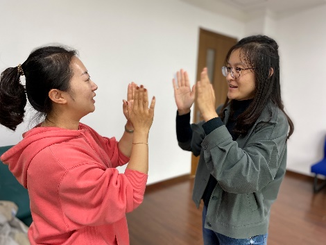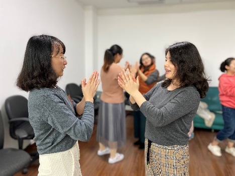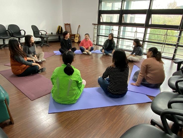 第二部分的舒缓活动是席地而坐,用手指敲击地面或者发出声音来自己创作音乐。老师们可以闭上眼睛,完全地放松下来。老师们一开始还比较拘谨,放不开,但是随着活动的进行,老师们慢慢放开了,随着陆老师的指引,自己创作了一小段韵律欢快原创音乐”。