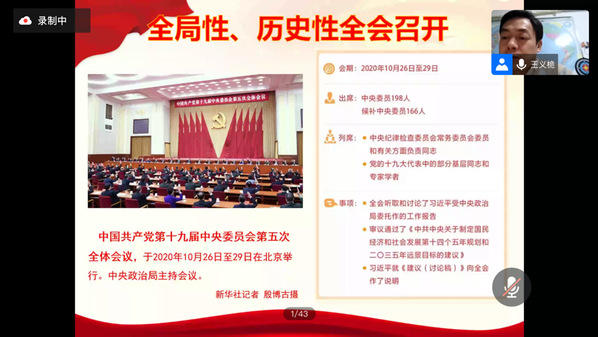 为深入学习贯彻党的十九届五中全会精神,教育引导支部广大党员进一步增强“四个意识”、坚定“四个自信”、做到“两个维护”,自觉把思想和行动统一到党中央决策部署上来。2020年11月,外语学院2020级学术型研究生党支部全体成员通过线上参与系列活动,认真学习了十九届五中全会精神。