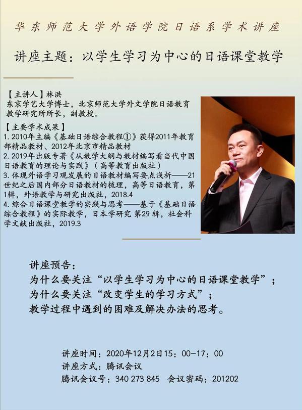 主讲人介绍:林洪副教授,北京师范大学外文学院日语教育教学研究所所长,自1984.9至今在北京师范大学任教,承担综合日语、日语听力、日语口语、日语笔译、日语教学法、日语教学技能训练、汉日语言对比研究等本科课程、日语课程与教材研究等研究生课程。