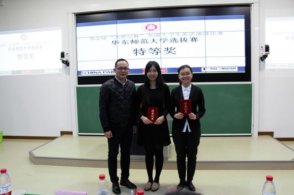 经过已备演讲、即兴演讲和回答问题三个环节的激烈角逐,最终,外语学院翻译系的郭依林同学和法学院冯怡婷同学力压群雄赢得本次比赛特等奖,并将代表华东师范大学参加上海地区总决赛。