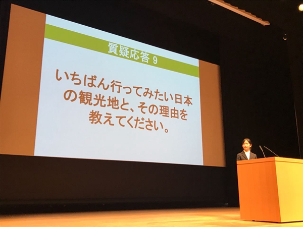决赛分为主题演讲和即兴问答两个主要环节。选手从“增进中日相互理解——我之所想我之所为”,“我要创办的企业”两个主题中任选一题,进行演讲。随后回答主持人随机提出的问题,如“请介绍一名中国知名运动员”,“请介绍你最想去的日本景点及理由”,“请介绍你最尊敬的中国历史人物及理由”,“请介绍你最喜欢的日语词汇及理由”。选手们从各自的亲身体验出发,从不同角度阐述了自己的看法,赢得了评委和台下观众的认可。