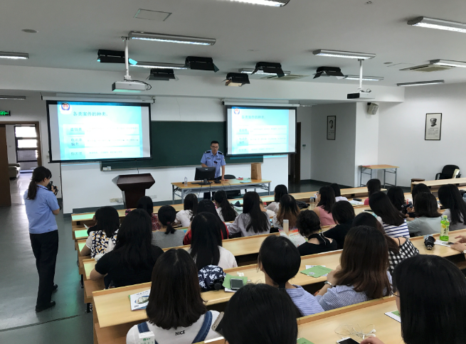 9月14日上午,外语学院邀请高校派出所的王警官和李警官在外语楼333开展了大学校园安全专题教育。王警官向新生讲解了诸如防火、防盗、防骗、交通安全等八个方面的问题。通过列举高校真实案例、播放典型案例视频等方式,他指出了大学生防盗意识淡薄,容易轻信他人,导致钱财损失,人身安全遭到威胁的现状。同时,他还向新生们简单介绍了窃贼偷盗的惯用伎俩,希望新生们注意宿舍防盗,时刻保持警惕,不给盗贼留下可乘之机。警官还用一些公益广告、幽默的小视频介绍了当今社会繁杂多样的诈骗手段,大家在惊讶的同时也深深的认识到拥有电信安全意识和知识是多么的重要。在分享提问环节,同学们也说出了自己经历的一些骗局,例如短信电话诈骗、微博中奖,冒充QQ好友,淘宝刷单,警官都一一给予回应。在讲座的最后,警官提出:希望新生们能够用实际行动,真正做到遵纪守法,成为一名文明、健康、有为、诚信的大学生。