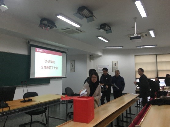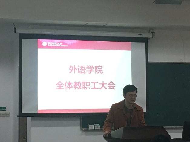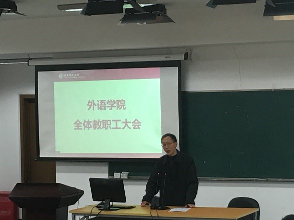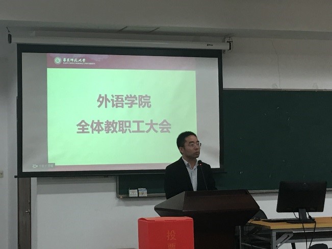11月22日下午,外语学院在333报告厅召开全体教职工大会,对侯敏跃和杨延宁两位副院长一年试用期进行考核,并通报教育部本科教学审核评估工作情况。学校党委组织部副部长王柏俊、组织部干部监督室主任王琳出席会议,院长袁筱一,党委书记俞黎阳,副院长朱晓映、侯敏跃、杨延宁,副书记兼副院长庄瑜及外语学院全体教职工参加会议。