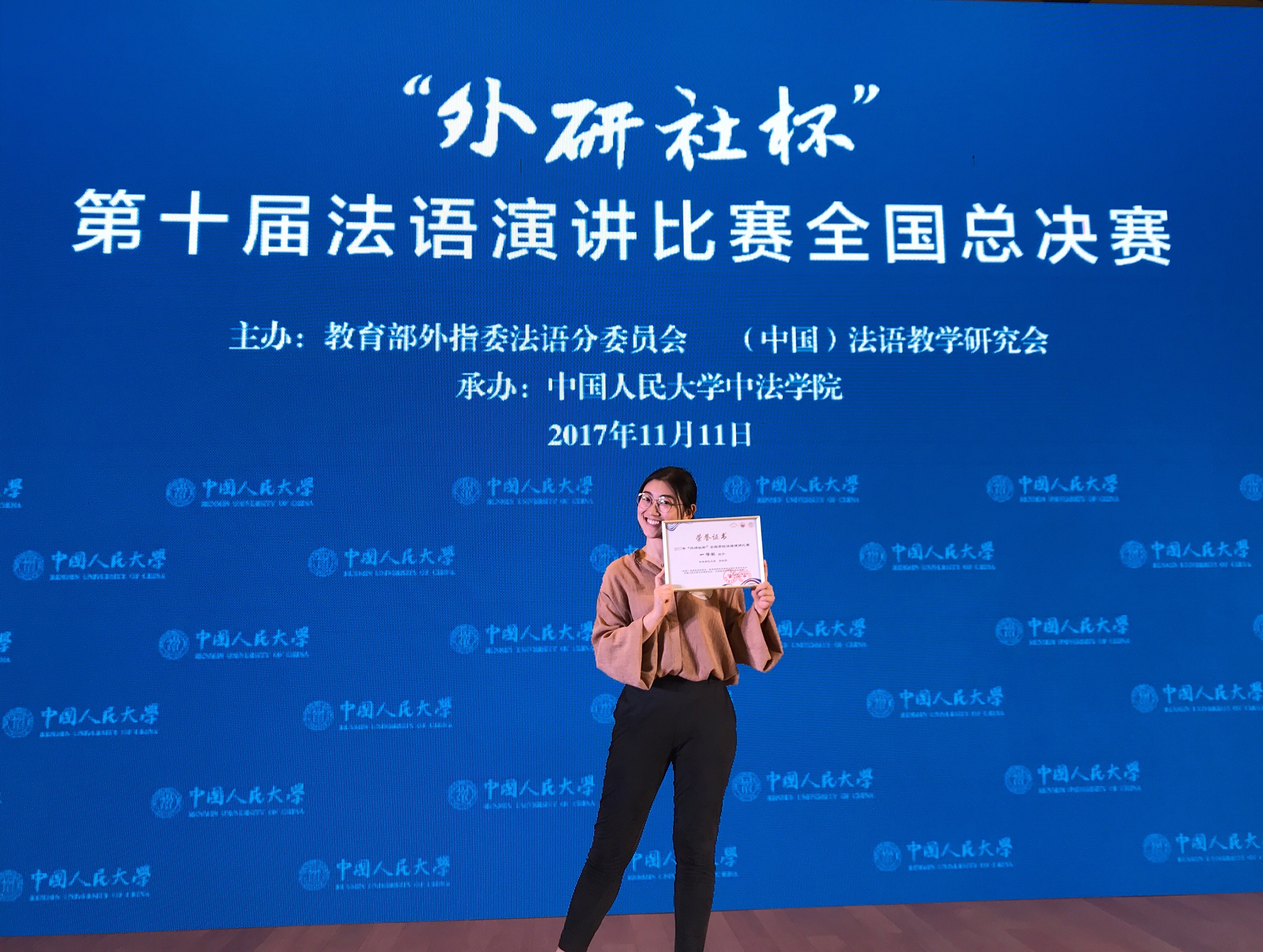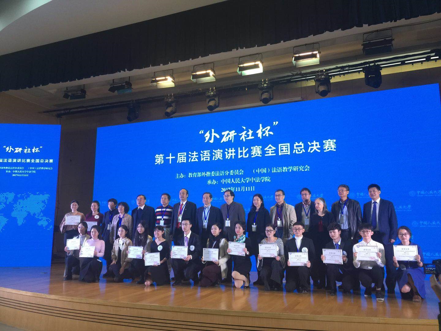 2017年11月11日,“外研社杯”第十届法语演讲比赛全国总决赛在中国人民大学中法学院隆重举行。我校外语学院法语系2014级本科生孙佳慧代表华东师范大学参加了此次比赛,并喜获一等奖。