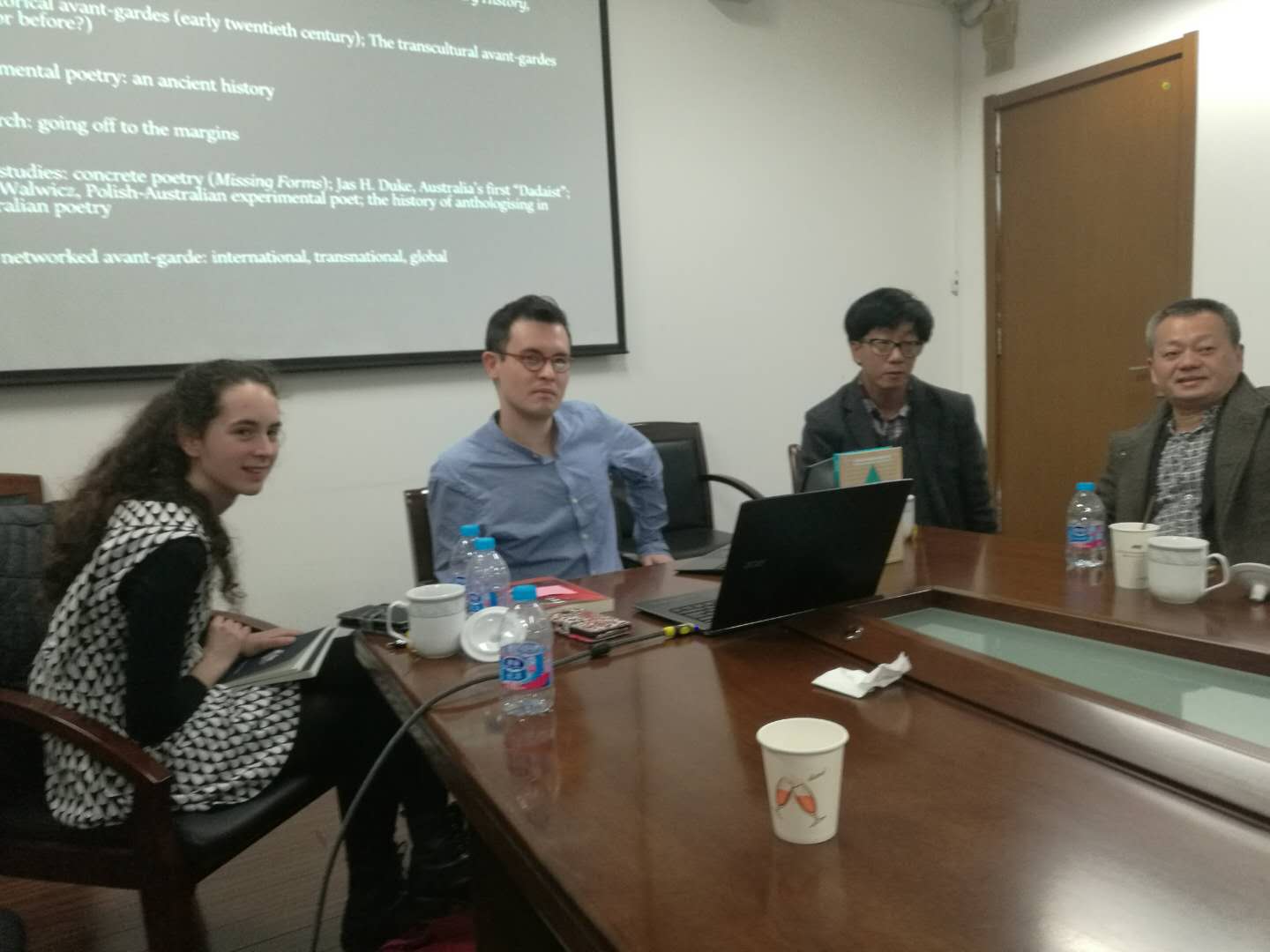 由华东师范大学澳大利亚研究中心主办,华东师范大学澳大利亚文学论坛于2017年11月29日举行,论坛的主题为“三人行,必有我诗”,旨在从诗歌的角度看澳大利亚双语文学和澳大利亚先锋文学。在华东师范大学澳研中心陈贝贝博士的组织安排下,本次论坛邀请到了三位澳大利亚诗人和三位上海本土诗人进行文学的碰撞。