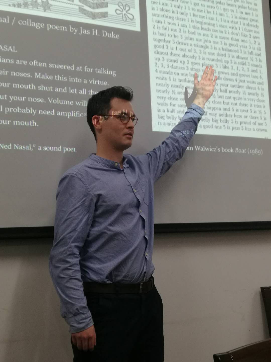 三位澳大利亚诗人既是文学创作者,也是文学批评者。欧阳昱教授做了题为“诗歌与时间的囚徒:第188号,其诗,其思,其字”的讲座,讲述了他在80年代创作的现场诗,实验诗,以及口语诗和生态诗。 欧阳老师诙谐幽默的讲述方式,俘获了听众的心,很多听众表示,诗歌原来可以如此好玩。 Carruthers博士做了“澳大利亚先锋诗学的历史与现状”的讲座,从澳大利亚的先锋实验诗的历史谈起,从达达主义谈到澳大利亚当今的先锋诗人。他的讲座令人耳目一新,来自英语系的张峰辉老师表示,这些诗歌闻所未闻,大开眼界。Dale博士围绕“Poetry and Book Object”谈了她对“概念诗”的理解,并且与听众分享了她的第一本诗集“Constitution”的写作过程。通过三个诗人不同风格的讲座,听众们体会到了诗歌的多重魅力。