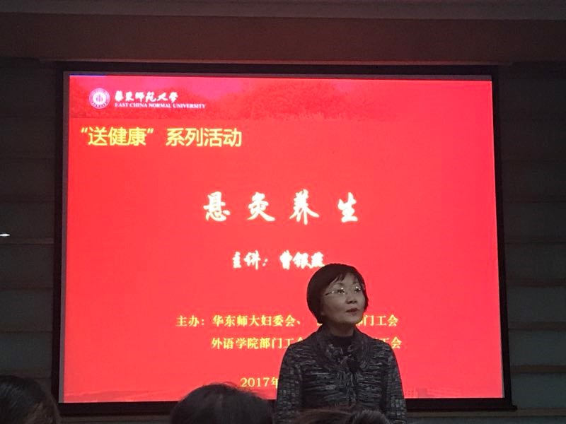 11月30日,由华东师范大学妇委会、出版社部门工会、外语学院部门工会、音乐系部门工会在中北校区工会大厅举办 “悬灸养生”健康养生讲座,邀请了上海市针灸学会保健专业委员会副主任曹银燕医师为老师们讲解悬灸养生的好处。