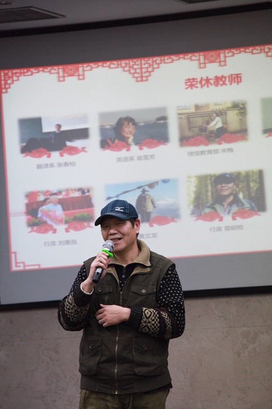 “外院荣光、薪火相传”,联欢会以精心筹备的2017年退休教职工荣休仪式作为开场,退休教职工代表曾昭榕老师讲述了与外语学院的不解之缘,回顾了自己几十年的外院工作生涯,情感真挚,令人动容。曾老师还为大家清唱一段沪剧《为你打开一扇窗》来表达自己对外院的留恋之情。