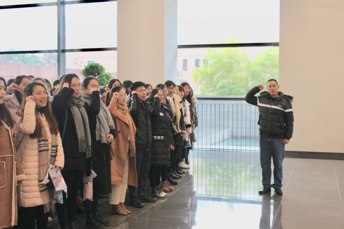 2018年1月7日上午十点,外语学院全体学生党员在学院本科生联合党支部书记高勇老师的带领下,集体参观了全国爱国主义教育示范基地——钱学森图书馆。参观开始前,学生党员们在高老师的带领下,于图书馆一楼大厅重温了入党誓词。通过宣誓,大家再一次坚定了自己的党员信念,明确了自己的历史使命与责任。