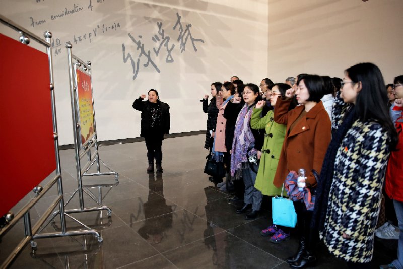 参观结束后,全体党员在用钱老的手稿制作成的雕塑“升腾的智慧”下重温入党誓词。党员们举起右手,面对党旗再次庄严地立下“为共产主义事业奋斗终身”的誓言。在钱学森图书馆重温誓词有特殊的意义:高校教职工党员应以钱学森的言行事迹为精神标杆,深入学习宣传贯彻党的十九大精神,爱党爱国、不忘初心、潜心科研、全力育人,为实现中华民族的伟大复兴贡献力量。