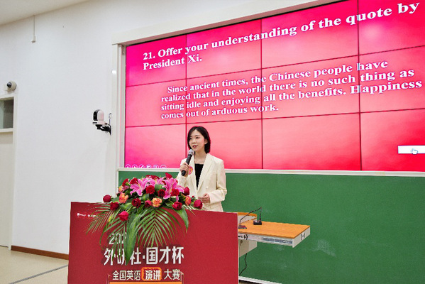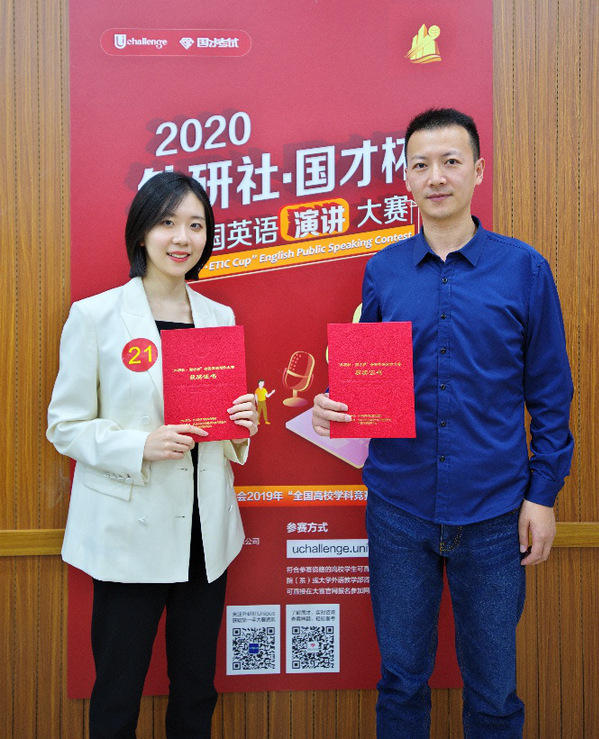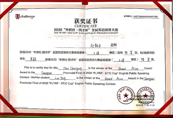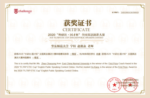 2020年11月21日,“外研社·国才杯” 全国英语演讲大赛上海市复赛在我校闵行校区举办。来自上海市各兄弟院校的27位选手同台竞技,展开激烈角逐。我院赵朝永副教授指导的学生罗颖表现优异,以全场第一名的好成绩获得“特等奖”,晋级全国总决赛。