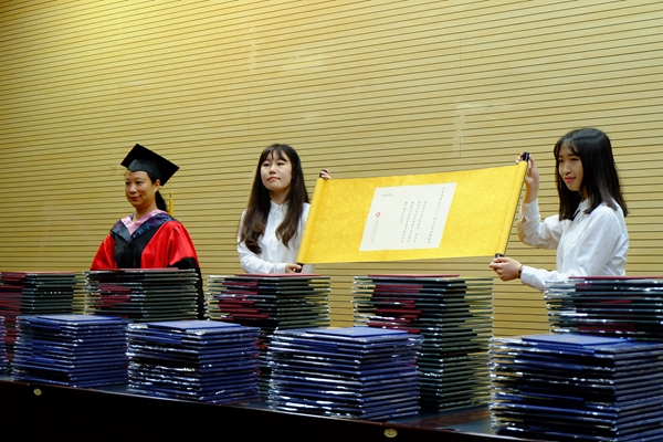 随后,外语学院学位委员会的老师们着导师服,走到台前,为本科、硕士毕业生们进行了隆重的“拨穗学位授予”仪式。毕业生们一个接一个的上台,从老师手中结果沉甸甸的学位证书和毕业证书,和老师们合影留念。