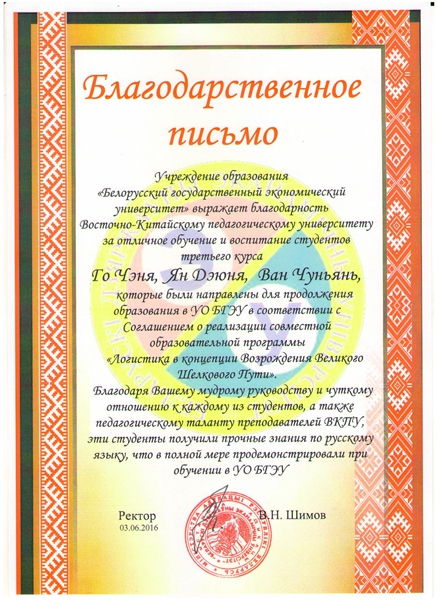 白俄罗斯国立经济大学(以下简称“白经大”)特向中国华东师范大学表达由衷的谢意,以感谢其对本科三年级学生郭程、杨德永、王春艳出色的教育和培养。以上三位同学是根据双方联合培养协议,为培养新丝绸之路国际贸易物流管理人才而被派往白经大学习。