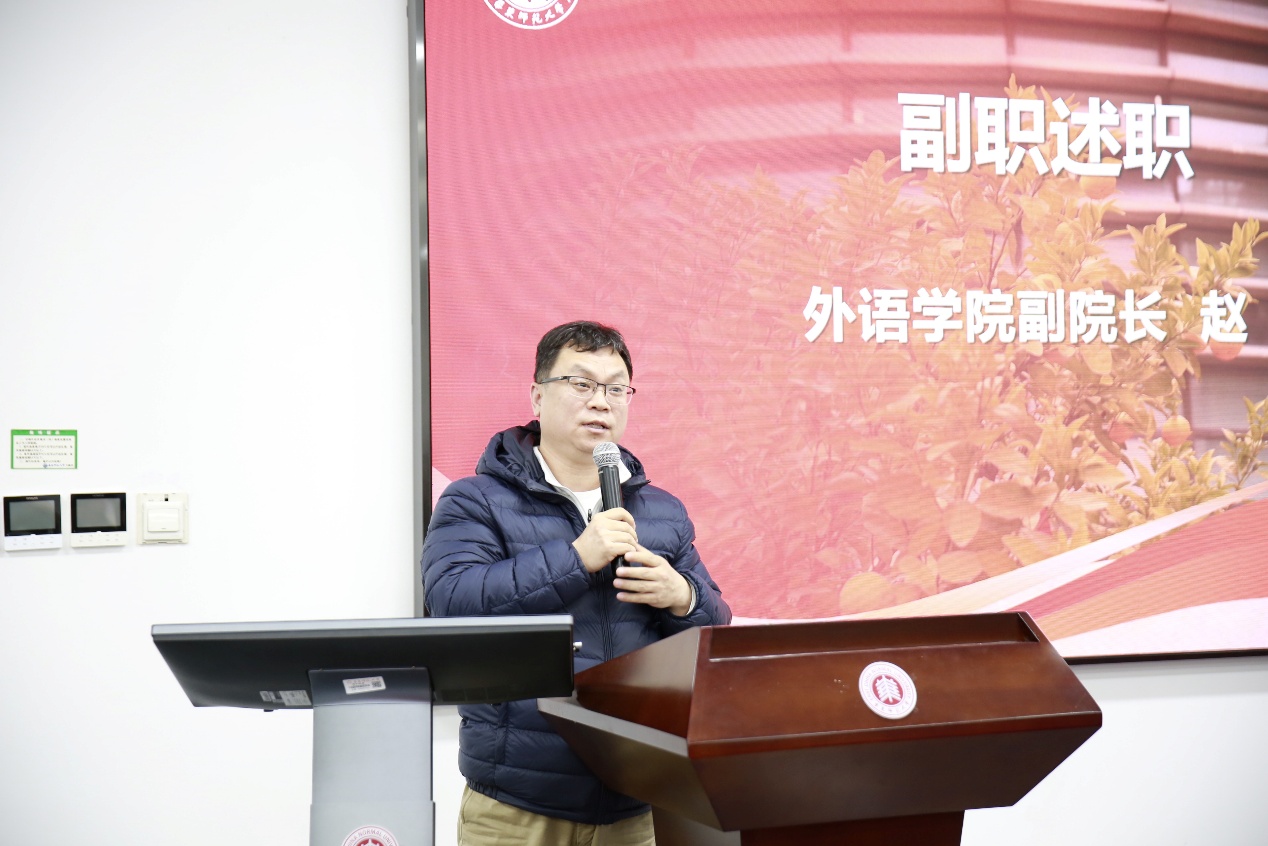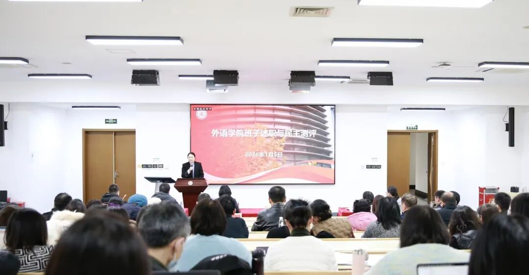 2026年1月5日,外语学院召开2025年度领导班子述职会。外语学院党委书记韩春红、院长杨延宁、副院长王静、副院长赵朝永、副院长赵刚、副书记兼副院长武娟以及全院教职工、学生代表150余人参加会议。