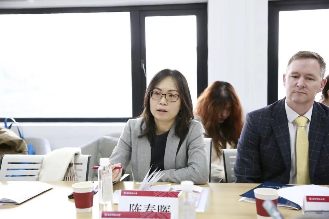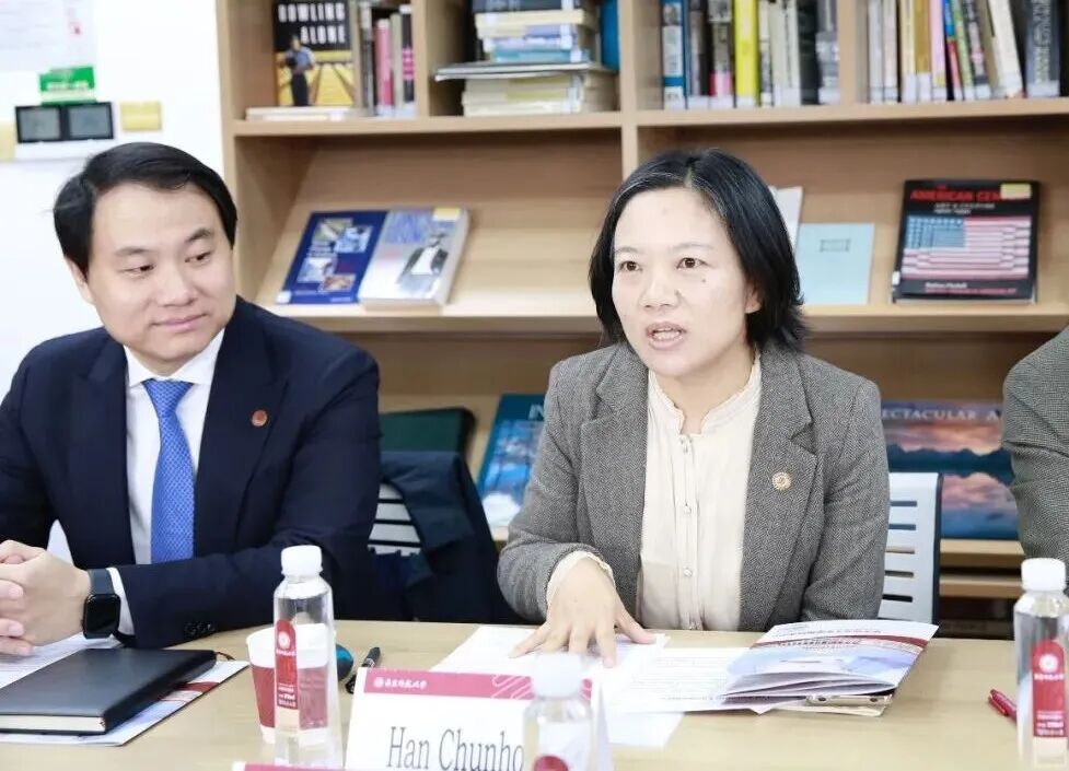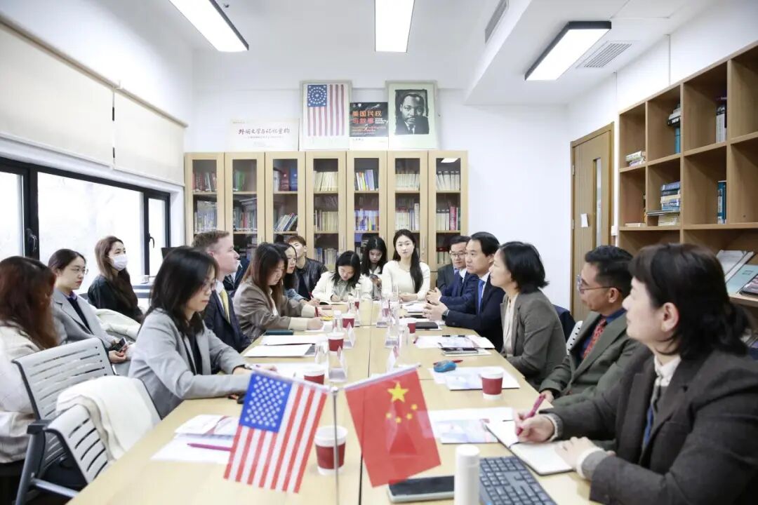 韩春红代表学院向包睿渊一行表示热烈欢迎。她介绍了外语学院的历史沿革、组织架构、人才培养成果以及“丽娃河畔翻译家”学术传统,并重点阐述了学院在推动区域国别研究、特别是美国研究方面的学科布局与科研规划。她表示,外语学院愿与美领馆新闻文化处加强联系,共同搭建中美学术对话与人文交流的平台。