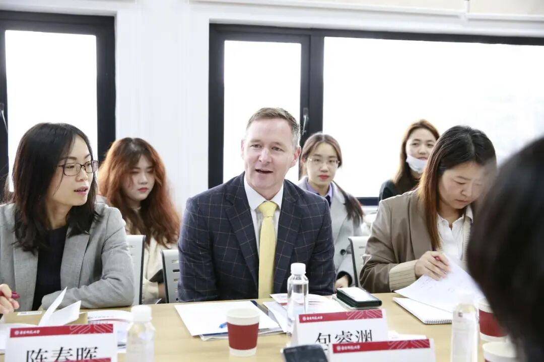 2025年12月19日,美国驻上海总领事馆新闻文化处文化领事Michael Bowerbank(包睿渊)、公共关系专员李丹、助理陈春晖一行访问华东师大闵行校区。国际合作与交流处副处长张锐,外语学院党委书记韩春红、美国研究中心主任金衡山、美国研究中心执行主任、外语学院英语系系主任陈俊松,以及外语学院美国研究项目博士、硕士研究生代表共同出席座谈。双方围绕中美教育文化交流、学术合作项目、资源共享等议题展开深入讨论。会谈由陈俊松主持。