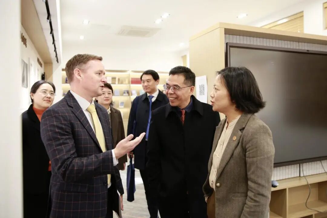 会谈结束后,包睿渊一行在外语学院师生陪同下,参观了位于外语学院一楼的“丽娃河畔的翻译家”成果陈列室,深入了解华东师大在外语翻译与跨文化传播方面的历史积淀与学术传统。