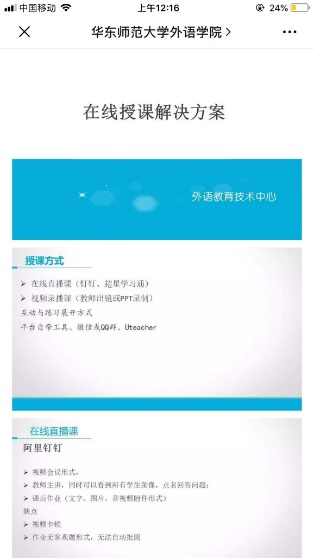 工作组确立各项工作方案保障工作落实:根据学校要求出台系列在线教学管理文件,全面保障本科教学正常运行。2月12日,学院制定了《2019-2020学年第二学期本科教学保障方案》,组织老师们在大夏、超星、智慧树等教学平台建课,并运用微信、QQ等社交软件建立班级群,邀请学生加入;2月13日,召开线上教学研讨会,集中讨论线上教学安排部署及师生关切问题;2月14日,完成了教师线上教学方式整体统计;2月16日,制定了《外语学院疫情防控期教学管理办法》; 2月20日,完成了平台授课准备工作的核查工作,统计完成各门课程在线授课方式;2月23日,制定了本科、研究生教学工作安排,并在学院公众号推送;2月24日,学院完成《华东师范大学疫情防控期间在线教学质量教师自查表》;2月25日,学院发布《外语学院专业实习替代方案》征求意见稿,并在29日通过教务处审核;2月28日前,任课教师完成了开学后两到四周在线课程的资源上传和教学准备工作;3月初,学院制定了《外语学院在线教学期间教学质量保障方案》;3月2日至6日,根据学校的安排,教师开始对在线教学平台功能进行压力测试; 3月9日,外语学院正式开始线上教学工作。