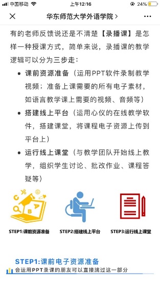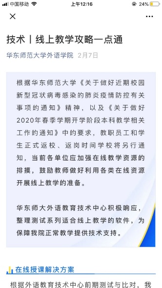 学院充分发挥外语教育技术中心的力量,成立“云技术服务组”为教师提供远程定向指导,全天候为老师们在线教学工作排忧解难。“云技术服务组”对市面上现有的线上教学软件进行了详细调研,经过反复测试、研究与比对,从十余种产品中遴选出了适合外语线上教学的产品,分成直播课和录播课两类进行推荐。为了让授课教师更详细地了解在线教学的操作逻辑和软件的使用方法,技术组的三位老师精心制作了各款软件的操作视频和文字教程,通过外语学院微信公众号整合发布。截至2月20日,微信文章累计阅读量超过7000人次,详实的解析和简易的操作流程得到了老师们的认可,除外语学院教师外,其他院系和高校的教师都从中受益。