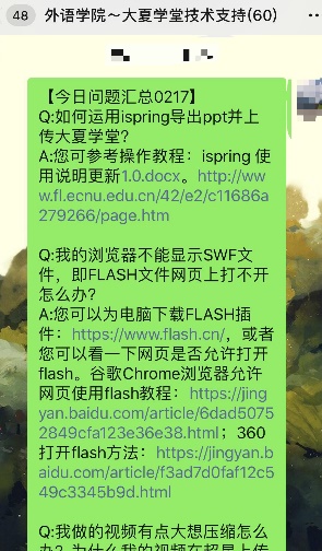 由于老师们在具体操作中存在实际问题需要具体解决,“云技术服务组”组建了“大夏学堂”、“超星学习通”、“直播平台”三个技术支持微信群,及时准确地为老师们提供专业的在线教学指导。从清晨到深夜,除了回答微信群中的问题,“云技术服务组”还为老师们进行电话辅导或远程视频指导、对接学校教务处解决问题。