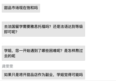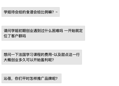 接下来,阮沁蓓分享了自己回国创业的历程以及创业过程中遇到的困难。她坦言:“将兴趣爱好转变为一项工作,是会遇到一些挫折的。”在法国学习期间,她学习了比较有名的甜点师的甜点模型,为自己品牌的创建提供了思路和雏形。然而,创业的起步是非常难的。因此,她针对“起步难”的问题给想要创业的同学提出中肯的建议: