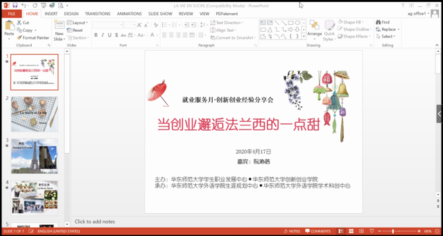 2020年4月17日下午14:00,华东师范大学外语学院开展第三次就业服务月、创业活动月活动,活动由学生联合会生涯规划中心和学术科创中心承办。来自2015届外语学院法语专业毕业生阮沁蓓以 “创业邂逅法兰西的一点甜”为主题为同学们分享了自己的创业梦想、创业历程和创业经验。本次活动共吸引了62名师生。