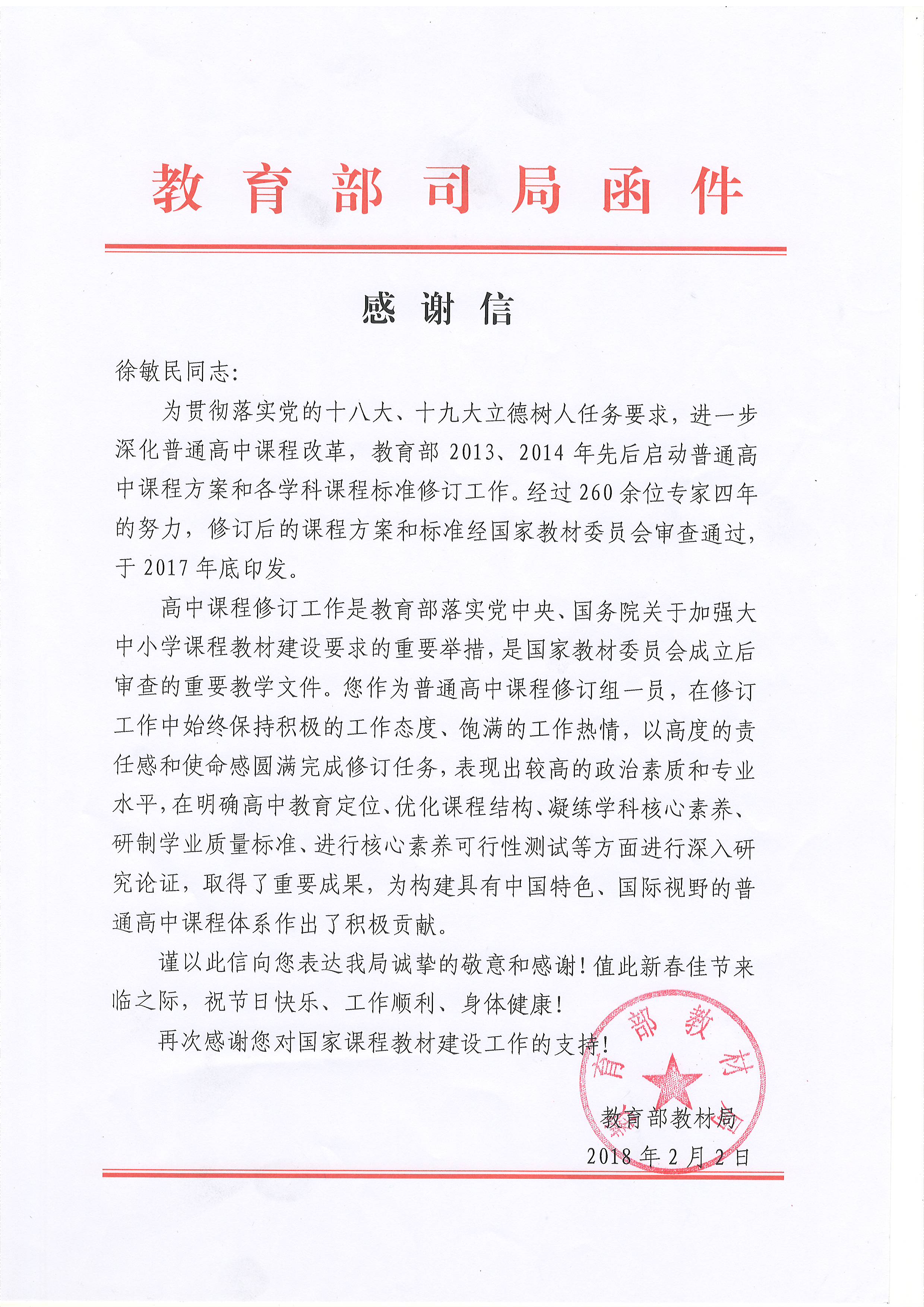 徐敏民教授还参加了教育部普通高中课程方案和学科课程标准修订工作。教育部教材司在感谢信中提到:“您作为普通高中课程修订组的一员,在修订工作中始终保持积极的工作态度、饱满的工作热情、以高度的责任感和使命感圆满的完成了修订任务,表现出较高的政治素质和专业水平,在明确高中教育定位、优化课程结构、凝练学科核心素养、研制学业质量标准、进行核心素养可行性测试等方面进行深入研究论证,取得了重要成果,为构建具有中国特色、国际视野的普通高等课程体系做出了积极的贡献”。