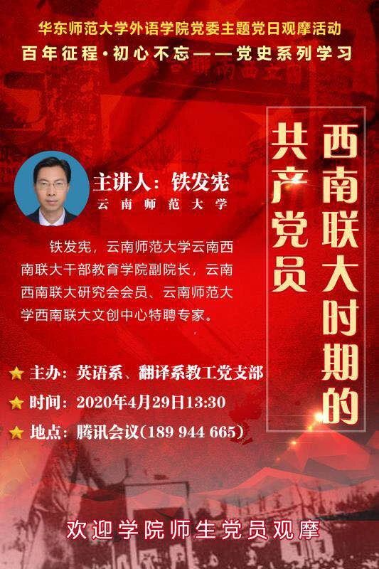 2020年4月29日下午,根据外语学院党委部署,英语系翻译系联合教工党支部在腾讯会议平台开展了“追寻战火下的西南联大精神,重思疫情中的大学使命”主题党日活动。会议由党支部书记全建强主持,支部党员全体相聚云端;50余名师生党员参加了在线观摩。