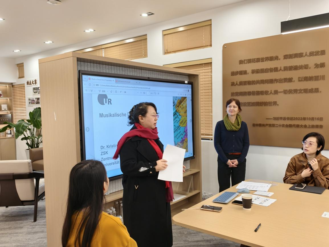 为深化中德文化交流,丰富德语教学形式,3月4日德语系特邀德国雷根斯堡大学Kristina Binder(克里斯蒂娜·宾德)副教授开展德国音乐文化主题讲座,讲座以音乐为纽带,融合德语语言学习与德国文化探索,为师生带来一场别样的跨文化交流体验。