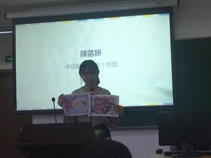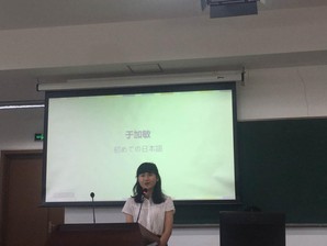一年级同学所选的题目均为“日语初体验”,4位参赛选手分别就自己最初同日语的接触以及对日语的印象、认识等进行了精彩的演讲,内容涵盖对日语暧昧性的理解、对不同的说话对象采用不同的说话方式、日语与文化的联系等。演讲形式丰富多样、风趣幽默,有演唱动漫主题曲、引用动漫台词、列举平时上课体验等,引起台下观众的共鸣,也可以从中看出一年级同学的青春活力。