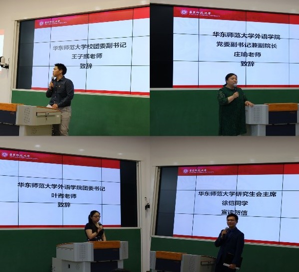 首先由大会主持人宣布会议开始,统计并汇报到会人数。随后全体与会人员起立奏唱国歌。与会领导及来宾介绍完毕后,华东师范大学校团委副书记王子彧老师对外语学院学生会、研究生会的工作予以高度的评价并为今后工作的开展提出建议;随后外语学院党委副书记兼副院长庄瑜老师、团委书记叶青老师先后发表致辞,就外语学院学生会、研究生会工作提出感想与意见;之后华东师范大学研究生会主席徐恺、学生会副主席翁小涵同学先后宣读贺信,预祝大会顺利召开。