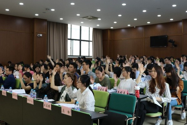 大会的下一项议程,由到场学生代表审议并民主表决通过了《华东师范大学外语学院2018年学生代表大会会议议程》、《华东师范大学外语学院2018年学生代表大会筹备工作报告》、《华东师范大学外语学院2018年学生代表大会筹备委员会名单》等文件。随后,大会休会五分钟,嘉宾退场,候选人抽签决定演讲顺序。