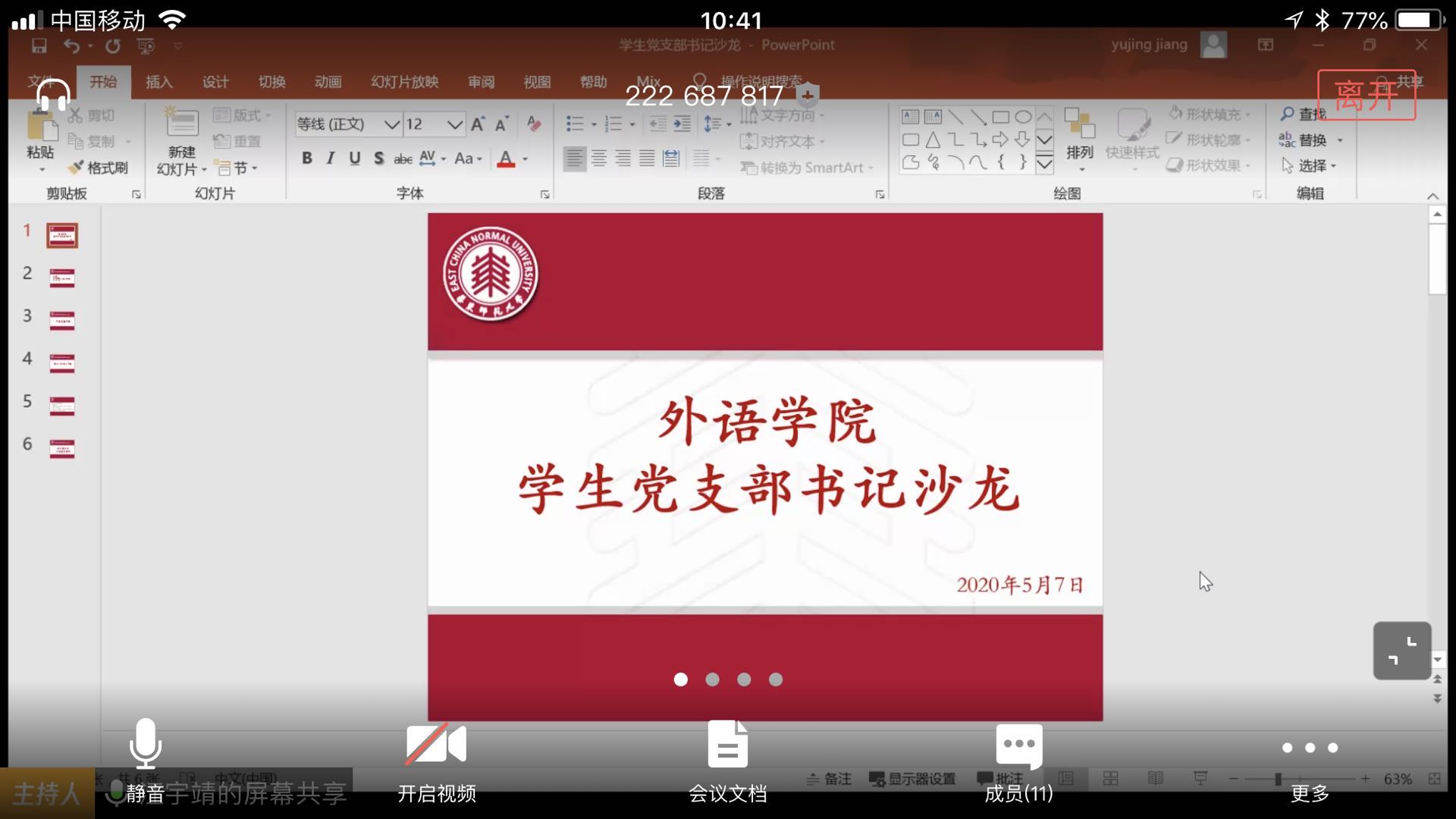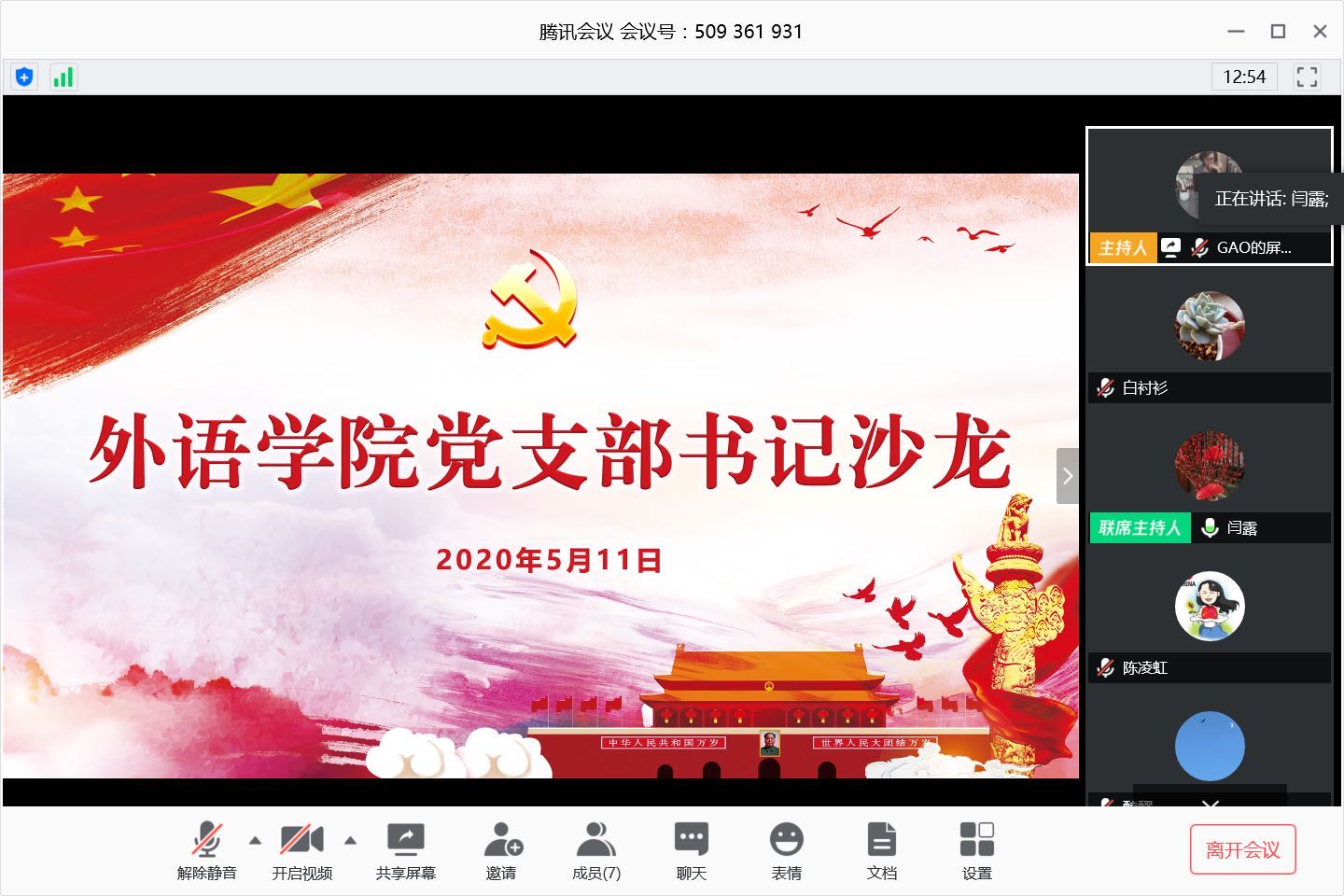 此外,学院党委还于5月7日组织了学生党支部书记沙龙,学生党支部书记、辅导员、组织员参加会议,党委副书记兼副院长江宇靖主持会议。会议讨论了学生党支部开展“四史”学习主题党日观摩活动安排,以及“100个双语党课故事”的策划事宜。与会人员认为,要依托外语学院学生党建中心,结合鲜活丰富的“四史”内容,采用当代青年喜闻乐见的方式,以学生党员的主体视角讲述党史故事,引导青年党员有理想、有本领、有担当,勇于肩负起时代赋予的使命与责任。