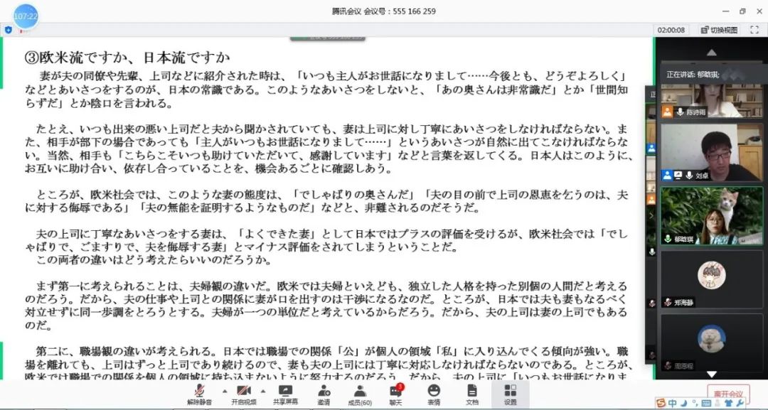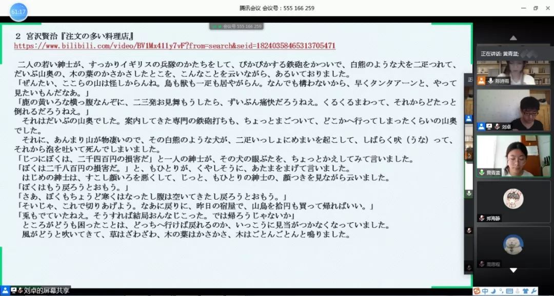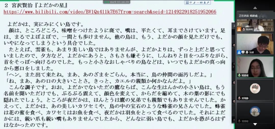 5月20日下午一点,外语学院日语系朗读比赛拉开帷幕。今年的这场比赛同往年相比显得有些“与众不同”,因为这是首次在线上举办的朗读比赛。受疫情影响,同学们虽然没能相聚在熟悉的教室里,但在此次线上的朗读比赛中,大家参与的热情依旧不减。日语系的全体老师和1-3年级学生也在现场聆听了比赛。