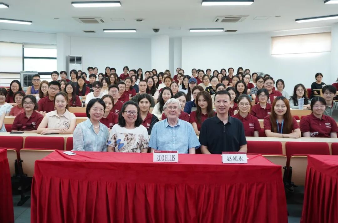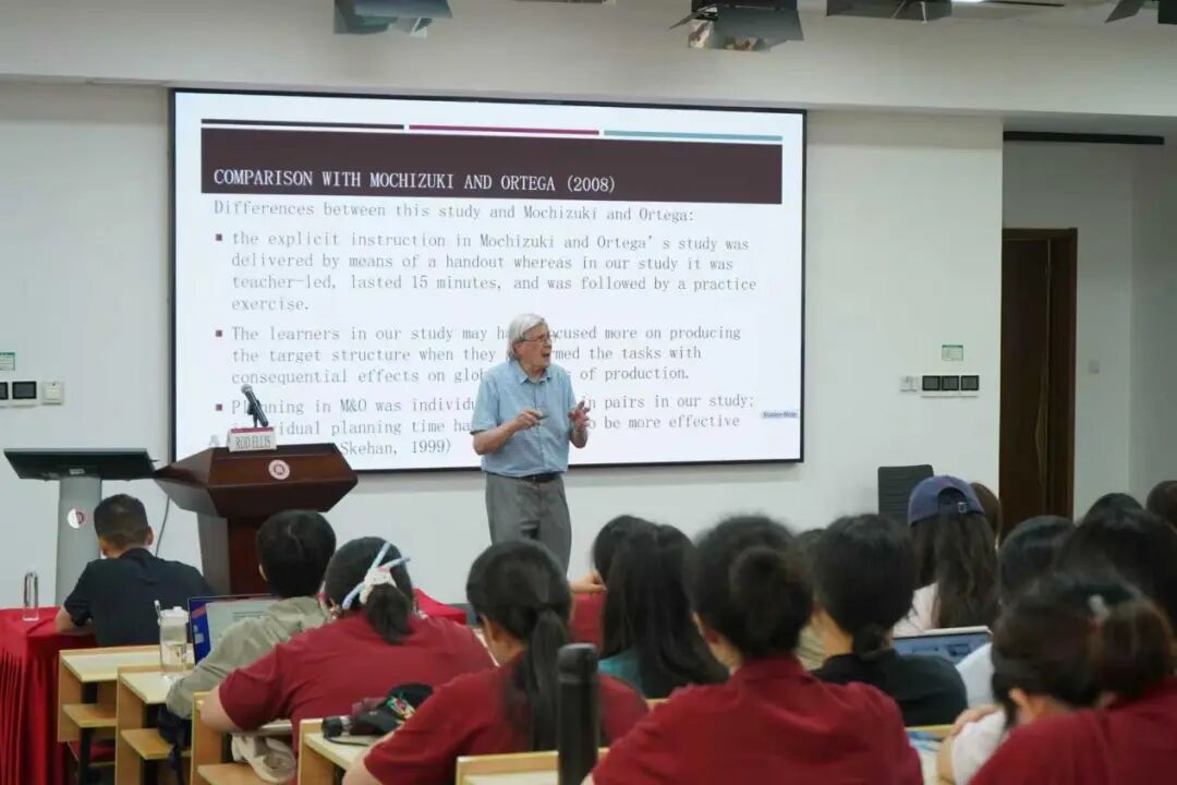 2025年9月16日,外语学院成功举办“全球智能外语教育名家讲坛(第1期),特邀国际应用语言学权威学者Rod Ellis教授主讲 “The effects of pre-task explicit instruction on the performance of a task(任务前显性指导对任务完成表现的影响)”的专题讲座。讲座由外语学院副院长赵朝永教授主持,吸引了来自校内外的众多教师教育研究者与硕博研究生参加。
