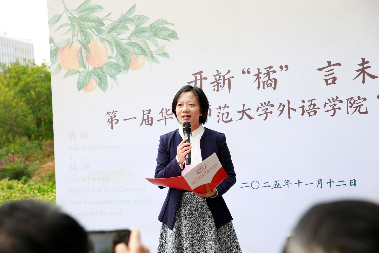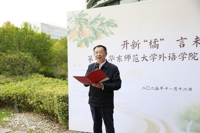 一年好景君须记,共赴外语“橘言”时。2025年11月12日,华东师范大学外语学院第一届“橘言”文化节在外语楼樱桃河畔正式启动。伴随着清雅橘香,师生校友一同采秋实、赏秋色,话育人、谋未来,以文陶铸人心,坚定育人使命。校党委副书记、纪委书记曹友谊,纽约大学兼职教授、联合国语言部中文组前组长何勇,外语学院法语系退休教授、橘园发起人何敬业,黄岩上海商会名誉会长、上海伊士通新材料发展有限公司总经理袁利敏,黄岩上海商会会长、上海元邦集团有限公司总经理吴文华,上海电器科学研究所(集团)有限公司副总裁、华师大校友陈红洁,校职能机关、兄弟院系领导及外语学院师生、校友代表出席活动。