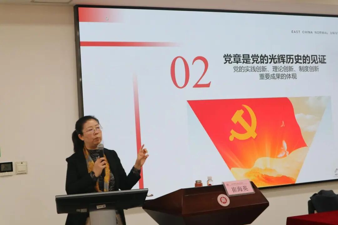 随后,马克思主义学院党委副书记崔海英教授作《学党章、听党话、跟党走——争做新时代好青年》的专题报告。崔教授围绕《中国共产党章程》解读开展专题辅导。她从“党章是立党治党管党的总章程”“党章是党的光辉历史的见证”“二十大党章的新内容”“争做新时代好青年”四个维度,系统阐述了党章作为党的根本大法的地位与作用,着重强调了新时代青年学子应肩负的使命担当。