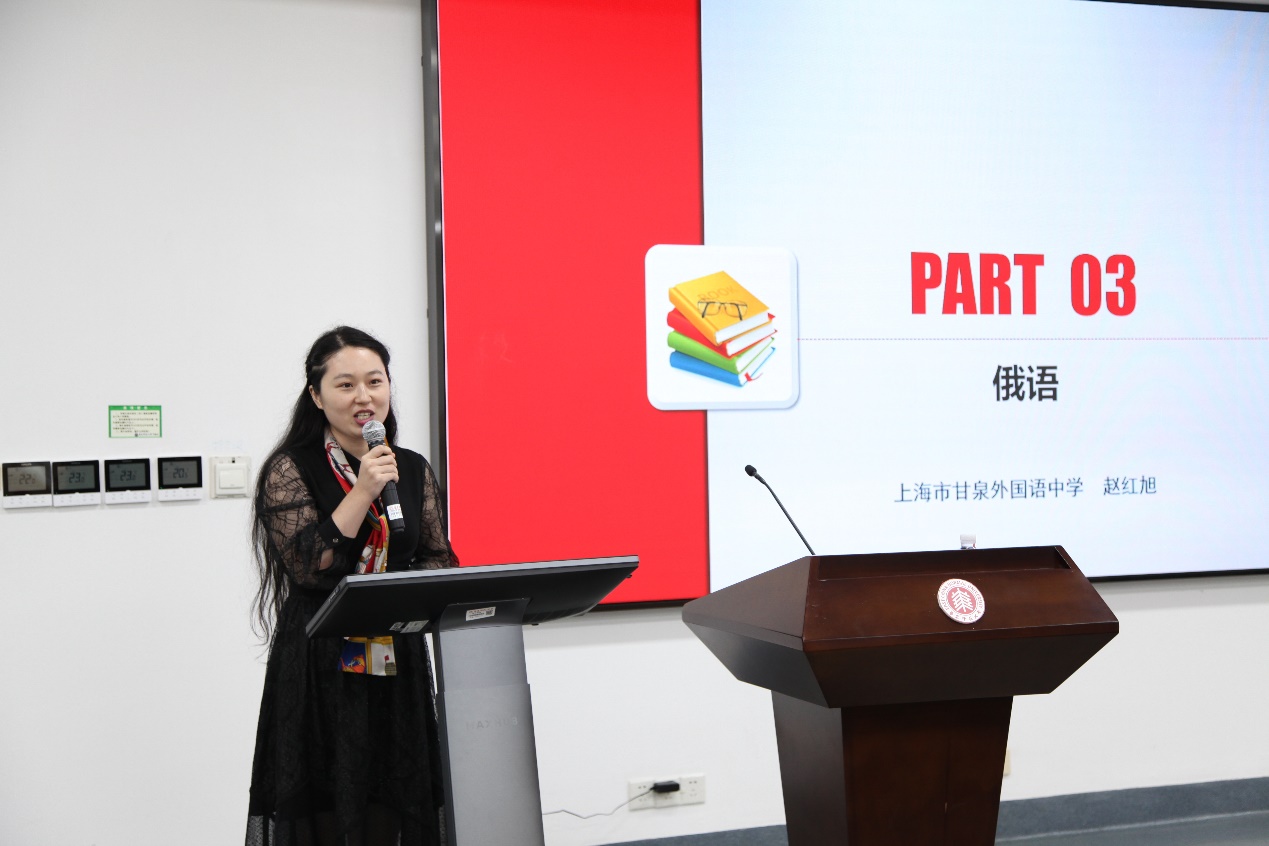 在随后的校友论坛上,上海市教育委员会教学研究室教研员郭侃亮、甘泉外国语中学日语教师王颖芳、甘泉外国语中学俄语教师赵红旭 、浦东外国语学校法语教师花威、闵行外国语中学德语教师赵苑琳、甘泉外国语中学西班牙语教师王媛媛就上海市中学关键语种的课堂教学与未来发展进行了汇报交流,从语言能力、文化意识、思维品质、学习能力等方面分享了自己在高中外语学科核心素养培育中的经验与体会。作为外语学院优秀毕业生代表,他们已经在中学关键语种教学研究领域躬耕多年,为关键语种教学做出了突出的贡献。希望借以优秀校友的精彩分享,给予师生思想的启迪与行动的方向,为关键语种学科建设添砖加瓦。