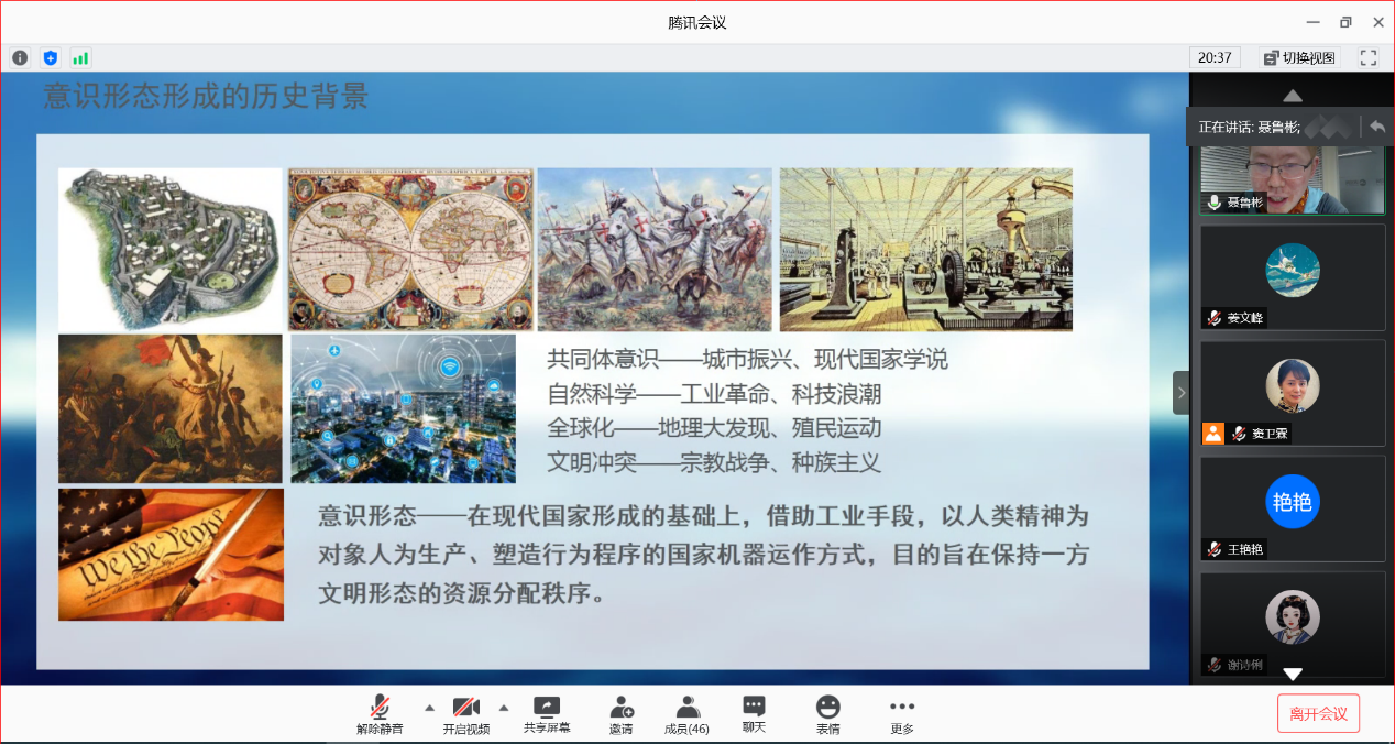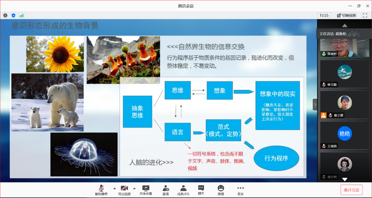 聂主编首先介绍了意识形态形成的生物背景。他指出,意识形态的产生与生物的进化并非截然分开。世界的生物与自然界都有一个信息交换机制,人脑的出现为世界提供了抽象思维。思维在现实世界之外产生了想象中的现实,同时,思维定势有时能起到强大作用。