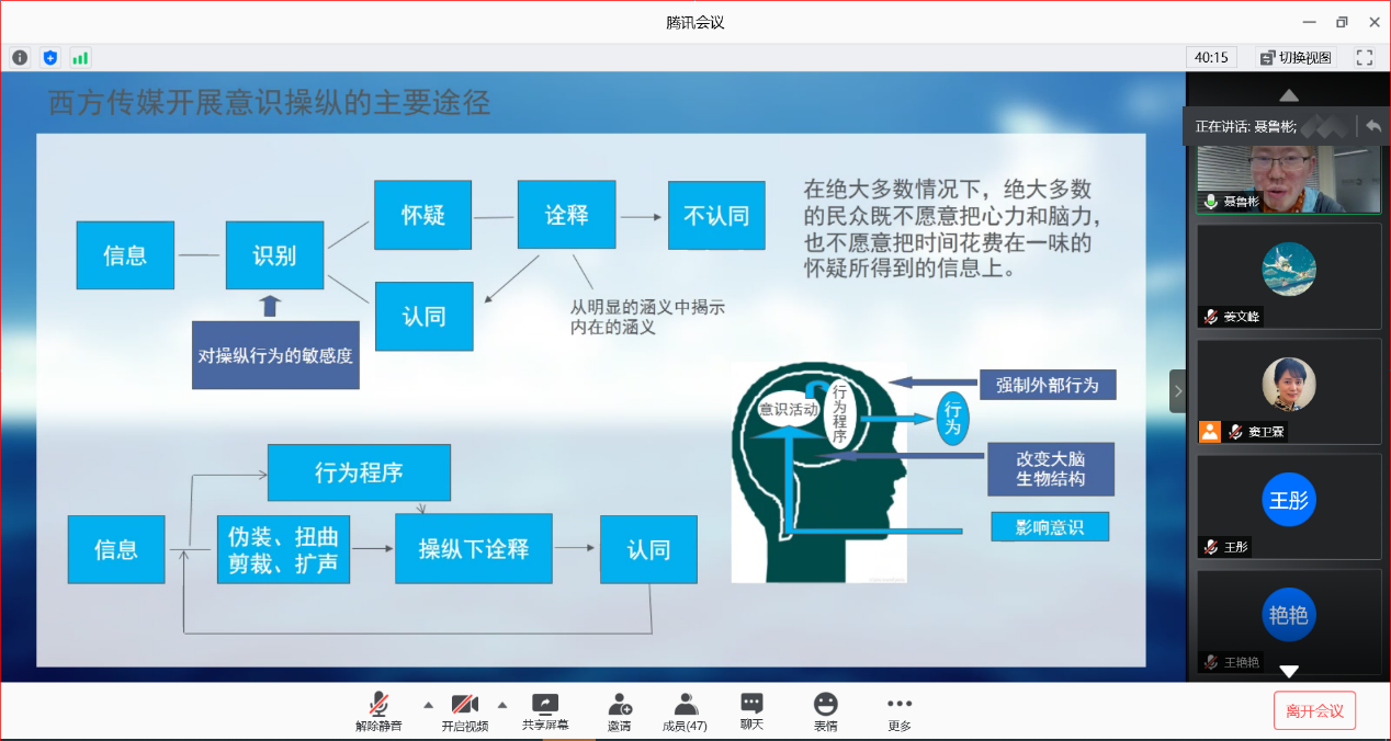 接着,聂主编向大家介绍了意识形态开展操纵活动的途径。当绝大多数民众既不愿意把心力和脑力,也不愿意把时间花费在一味的怀疑所得到的信息上时,意识操纵便能够展开。