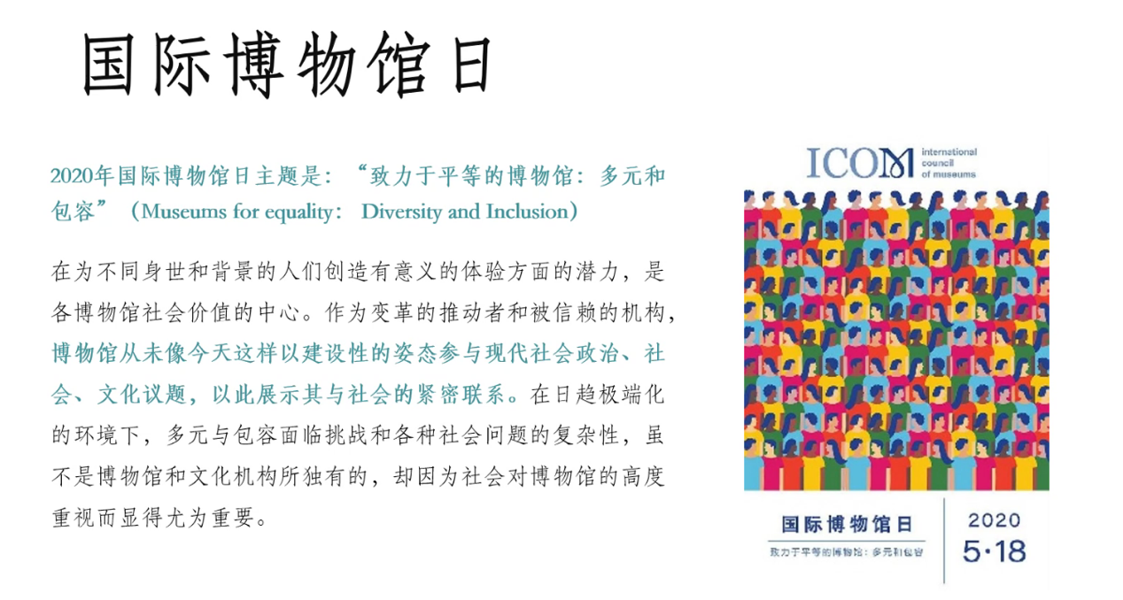 庄瑜老师的讲座从国际博物馆日的主题——“致力于平等的博物馆:多元和包容”作为引入,强调了博物馆与社会的紧密联系,呼吁当今社会应高度重视博物馆向多元和包容发展。紧接着,庄瑜老师介绍了博物馆的丰富概念和当下多元的博物馆形象,打破了大家先前对博物馆的刻板印象。