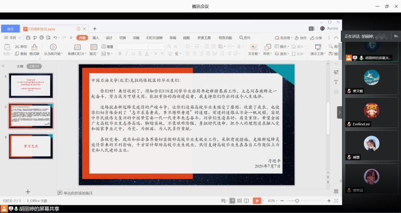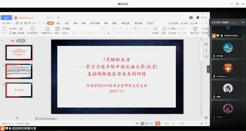 7月13日上午9点,2019级专业型研究生党支部在腾讯会议上开展了本月的组织生活。本次会议的主要内容是学习习近平给中国石油大学(北京)克拉玛依校区毕业生的回信。