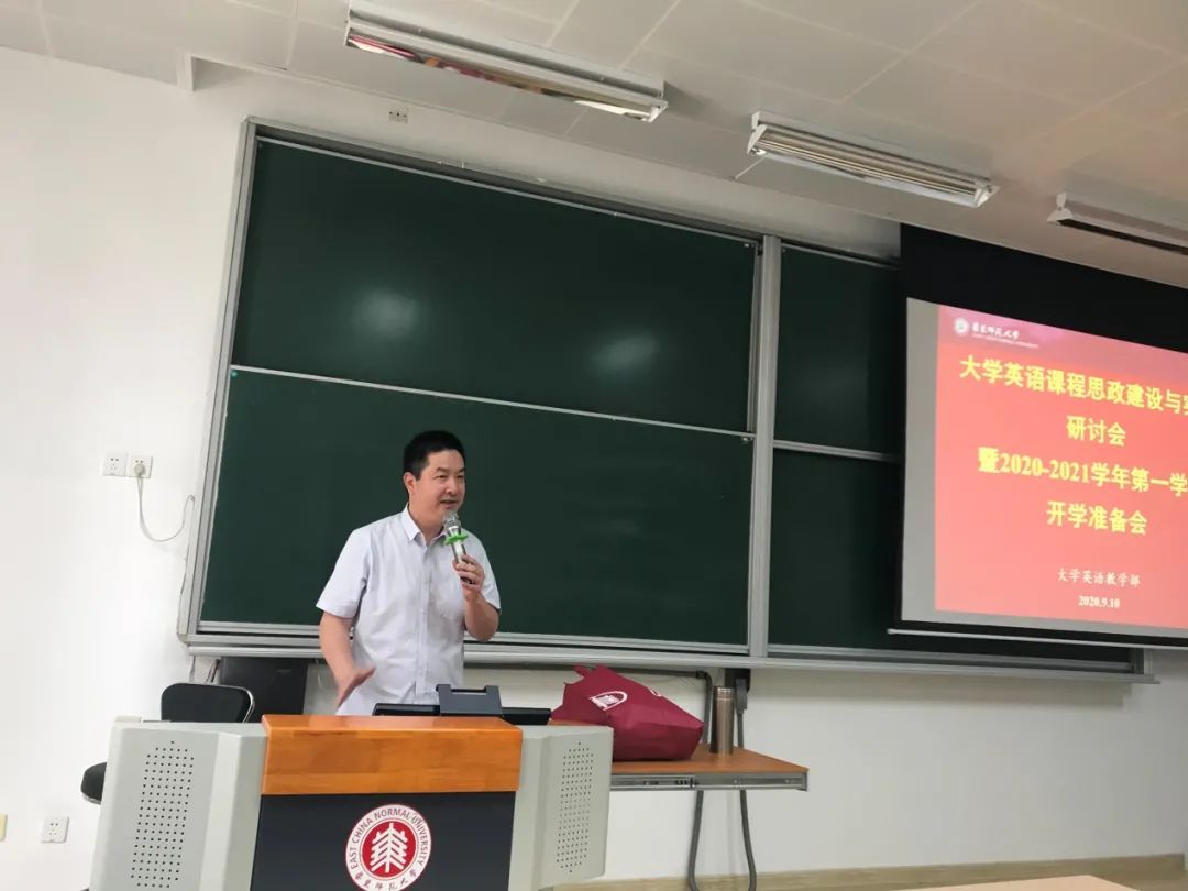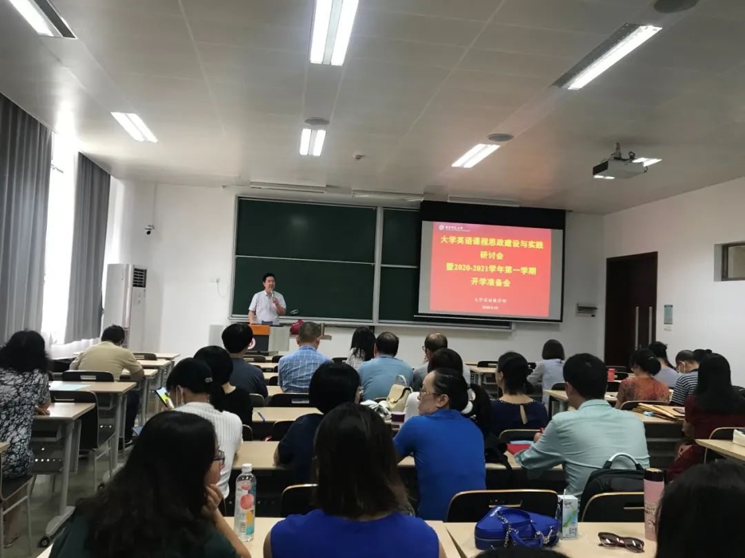 9月10日上午,外语学院大学英语教学部在中山北路校区教育书院120教室召开大学英语课程思政建设与实践研讨会暨2020-2021学年第一学期开学准备会。会议由大学英语教学部主任严文庆副教授主持并做课程思政主题发言,王珏副主任就开学各类考试及各项准备工作做了动员与部署,外语学院副院长朱晓映教授参加会议并做总结发言,全体大学英语教学部教师参加了本次会议。
