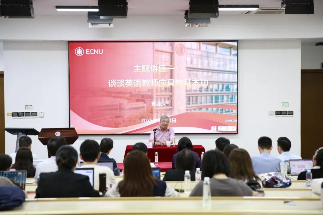 在主题讲座环节,原华东师范大学外语系主任黄源深围绕“谈谈外语教师应具的基本功”主题,以身说法传授教学与科研的经验。他结合自身求学与教学经历,指出扎实的语言基本功是外语教师的立身之本,语言能力如“逆水行舟,不进则退”,教师必须通过多读、多写来保持并提升语言水平。他强调,对高校教师而言,教书育人、站稳讲台是基本职责,扎实的教学能力同样是不可或缺的基本功。他提倡课堂教学应注重师生互动、强化正向鼓励,以此充分激发学生的积极性与创造力。对于如何做好科研,黄老师结合自己的经历,鼓励外语教师要树立学术自信,勇于深耕,切忌“矮化自己”,并提出可行路径。最后,他深情寄语,强调师德是为师之魂,唯有热爱学生、认真负责,方能不辱育人使命。