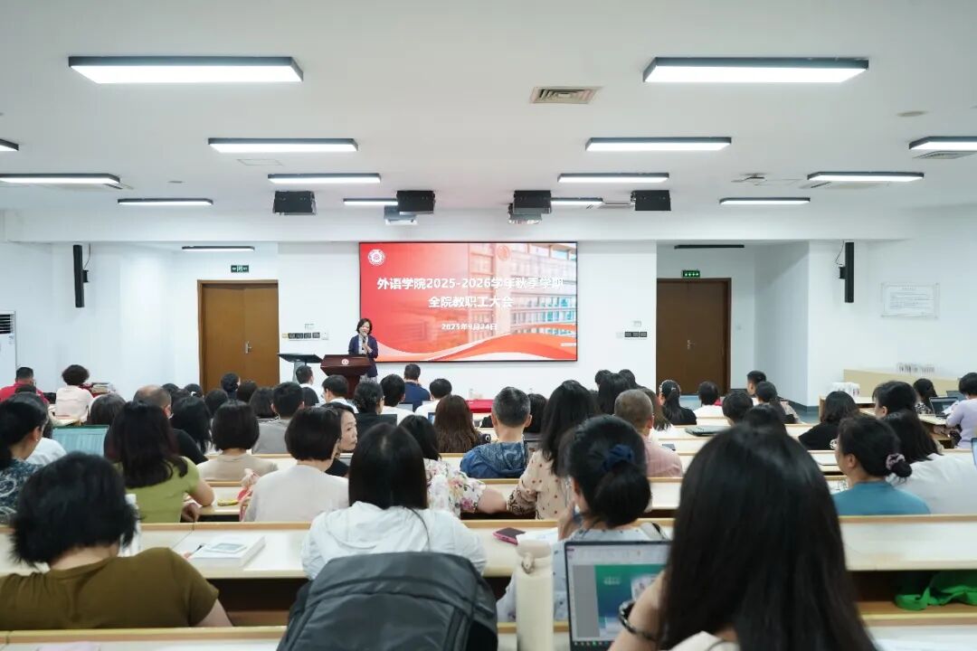 2025年9月24日,外语学院召开2025-2026学年秋季学期全院教职工大会。大会特邀原华东师范大学外语系主任黄源深教授、人文与社会科学研究院院长吕志峰教授开展主题讲座,全体教职工参加。