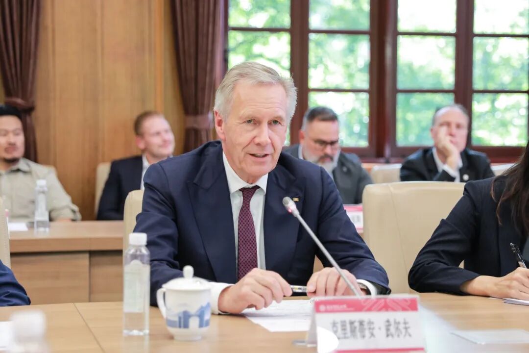 钱旭红校长在致辞中指出,正如“五十而知天命”所言,在中国文化中,半个世纪便象征着对世界的深刻洞察与智慧积淀。53年的中德建交,也使两国友谊愈发深厚且坚韧。在全球化面临挑战的当下,深化文明互鉴与多领域合作变得尤为重要。我校始终秉持国际化发展战略,已与柏林洪堡大学、汉堡大学、哥廷根大学、乌尔姆大学等15所一流德国高校建立了稳固的合作,近期更与乌尔姆大学签署了“3+1+1”本硕联合培养项目,持续推进中德教育协同与人才共育。钱校长还表示,中欧文明互鉴研究中心将以跨区域、跨文化、跨学科为基本视角,系统开展中欧文明比较、思想交融和历史互动研究,积极探索新时代中欧人文交流新模式。